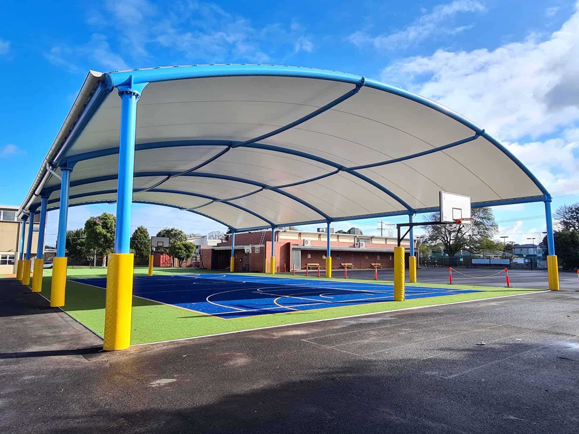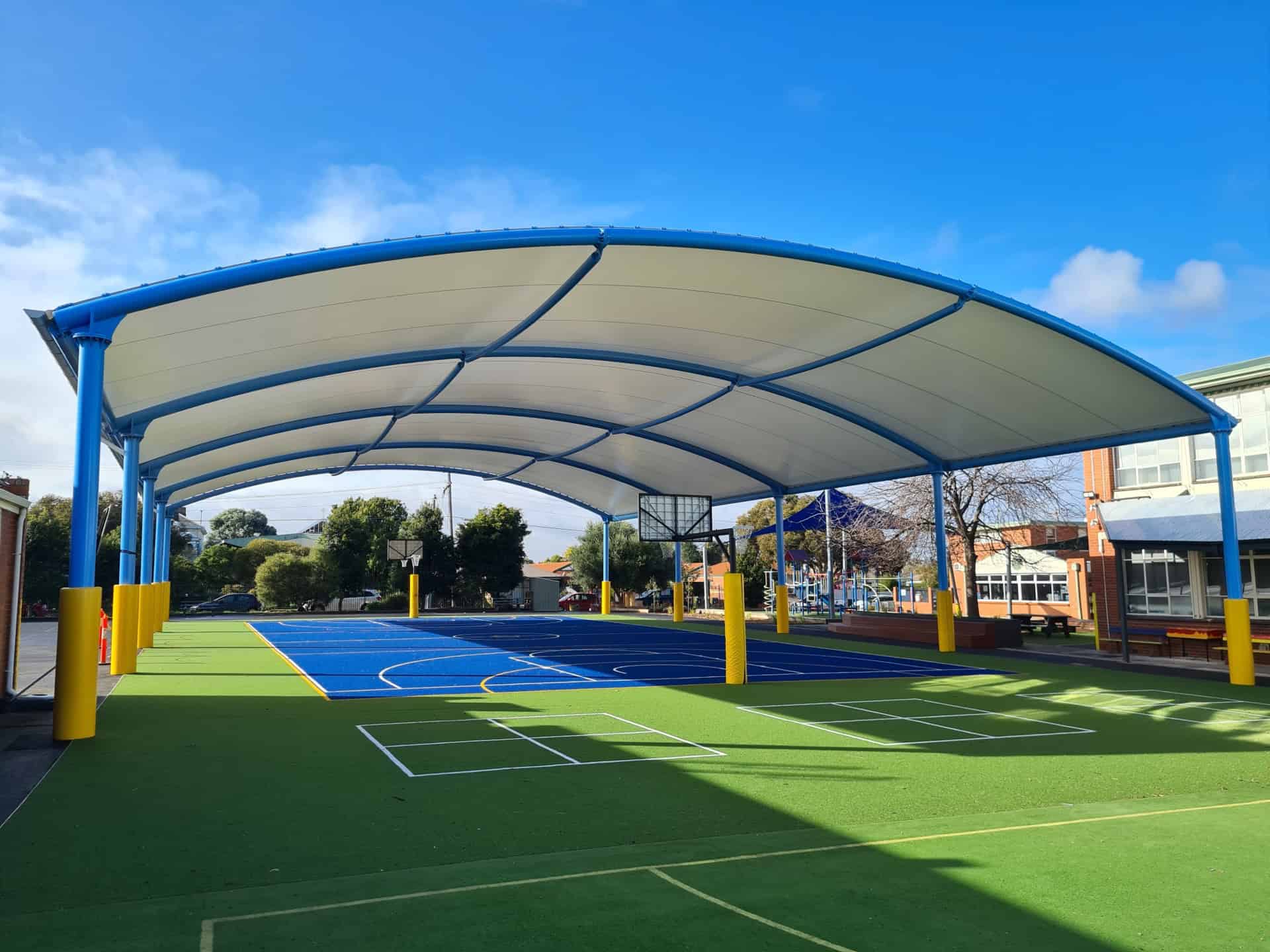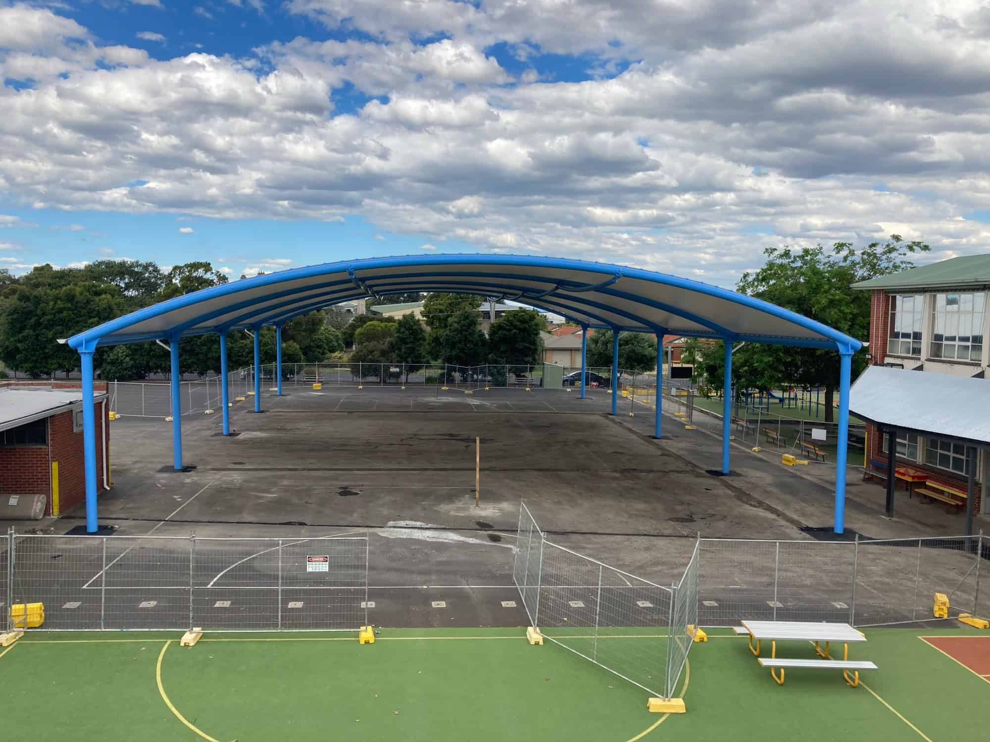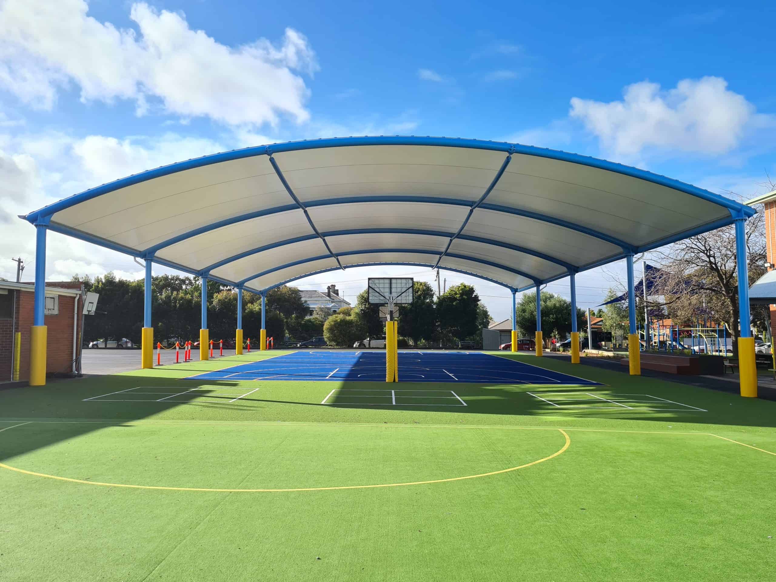 In a bid to offer students a versatile and weather-protected outdoor space, Corpus Christi Primary School partnered with ADMA Group to construct a Barrel Vault tension membrane structure over their basketball court. This project not only provided functional benefits but also added a modern architectural element to the school grounds.