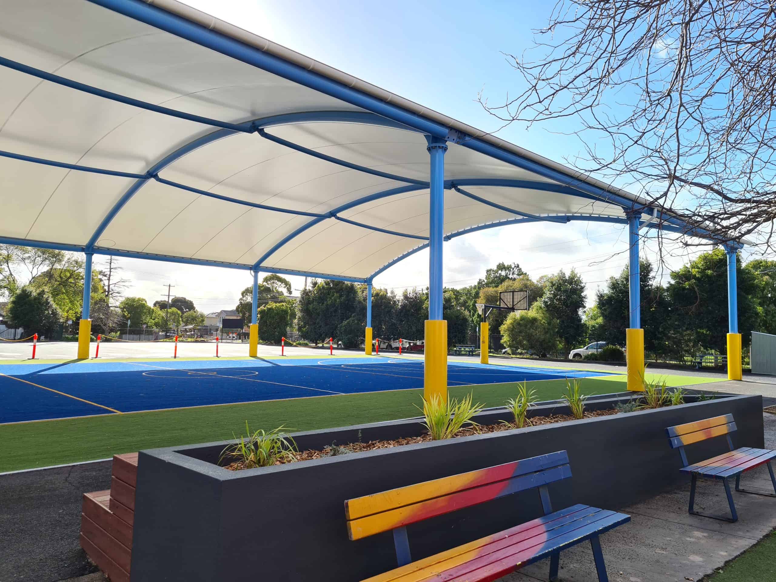 Learn about Myrniong Primary’s two 6m centre post umbrellas, offering maximum coverage with waterproof Valmex FR580 PVC in beige.